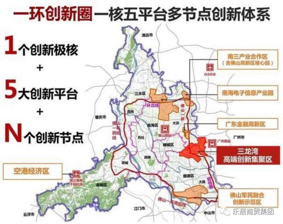 在佛山市提出的“一環創新圈”戰略規劃里提出,要建設成具有國際影響力和吸引力的科技創新圈,走“世界科技+佛山智造+全球市場”的創新發展之路。明確構建「一核五平臺多節點」的創新體系。